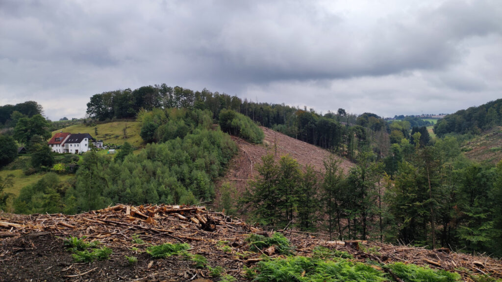 Links und rechts der Ennepe gibt es immer wieder mal die Gelegenheit für einen Abstecher zu Fuß, um die Gegend zu erkunden und die abwechslungsreiche Natur und den stetigen Wandel zu bestaunen. Wie zum Beispiel hier das saftige Grün und dazwischen die brachen Flächen, wo bis vor Kurzem noch die dicken Fichten standen :